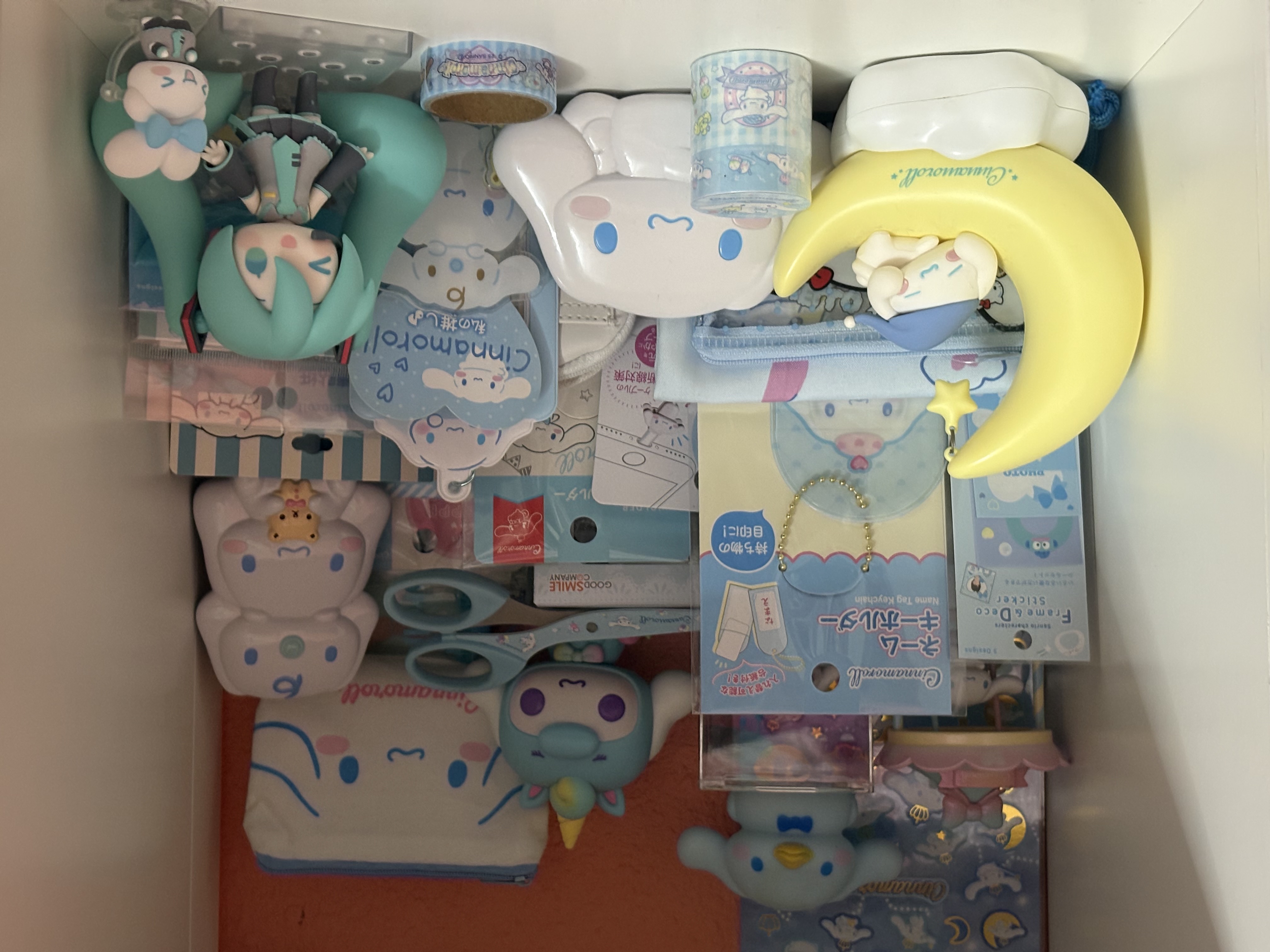 I brought my sister a bulk of skz stuff (cuz she asked me to) and also brought my cousin some bsd stuff as a gift :3. Also, while they were here, I reorganized my stuff and made one shelf specifically for (most of) the cinnamoroll stuff I have (excluding plushies and bags). I am going to redo another shelf when I finish all my hauls this month :3333 (Hint hint: books)