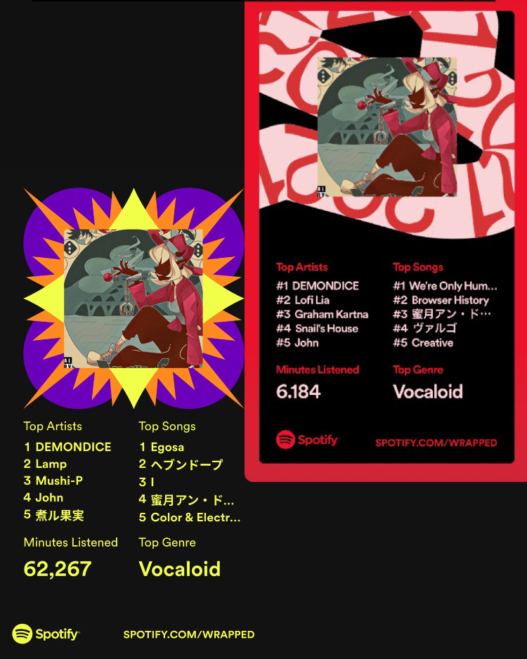 I think I have improved in my music taste over the years though, thanks to my sister listening to a lot of panic, meleanie...and k-pop back in 2017-2019, will never forget the day she introduced me to Miroh back in 2019, so fun ;w;!! Anyways, uh, back to my wrapped, I think they were okay, I've always been in Vocaloid and even my sister was in it back then too (though, she did leave it behind back in mid 2020). I only got into vocaloid around 2017-18 with GHOST and their release of "Spider on The Wall" w/ IA. I don't remember when I first heard of vocaloid because they were all those underground vocaloids you never hear. Like MIKI!!!! OMG I LOVEEE HER!! I only found out about her SV voicebank on monday (12/8) and O.M.GG her vocals are actually sooooo goood, like I'm so sad that majority of people will miss out on her like they did with Neko... though I have heard that people only skip out on certain vocaloids and their voicebanks because they are either to difficult to tune or.. for whatever reason honestly. If I had to be honest, I think it's that there are a lot of vocal banks out there to play with, and with many of them getting different SV and V3-4-5 versions, I wouldn't be surprised if that's the reason that people miss out on them. It could also be that the advertising for those vocals aren't the best either, but who am I to say? I'm just someone who is super invested in learning about all of them after I found out about MFC after all haha!!