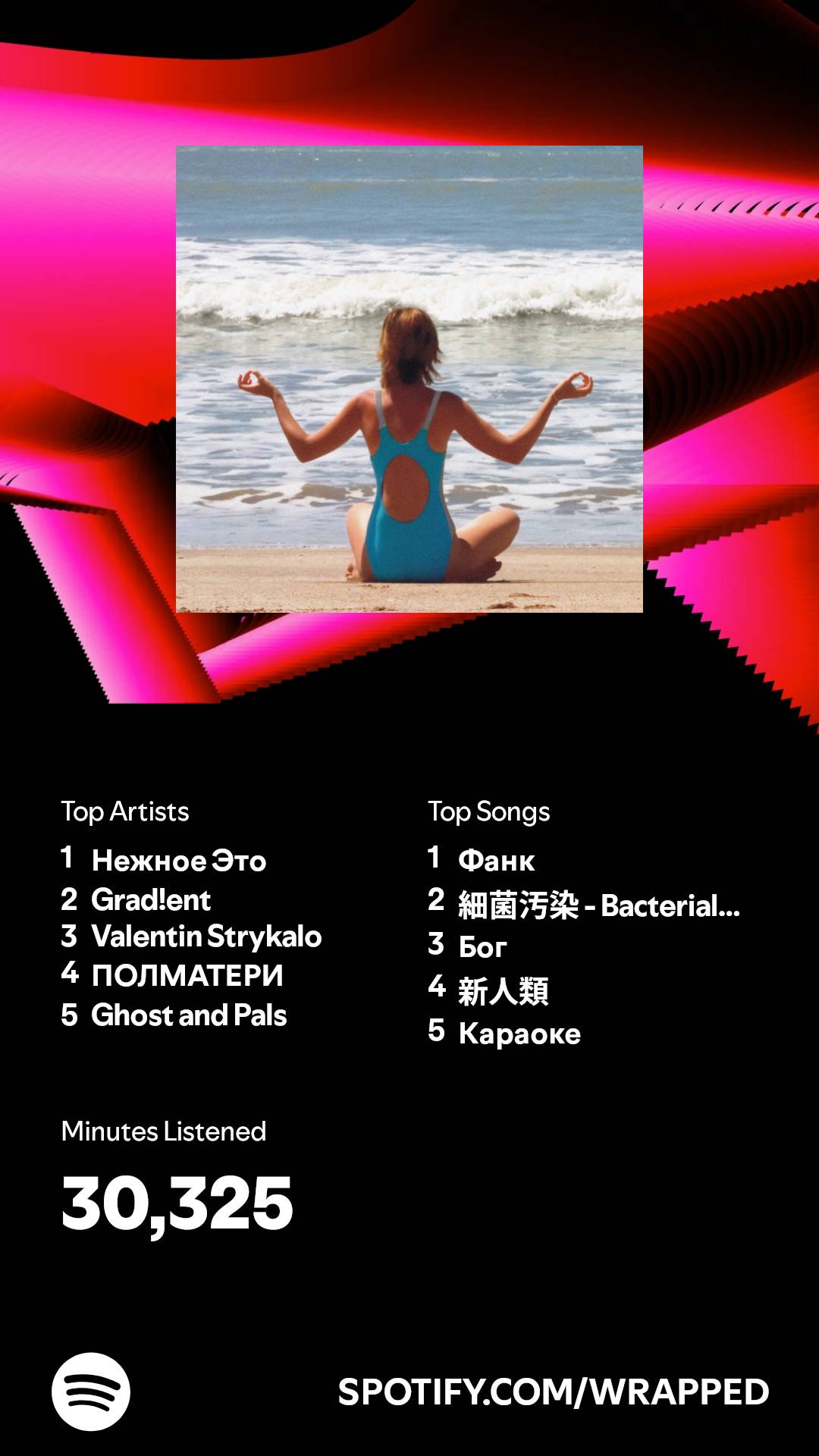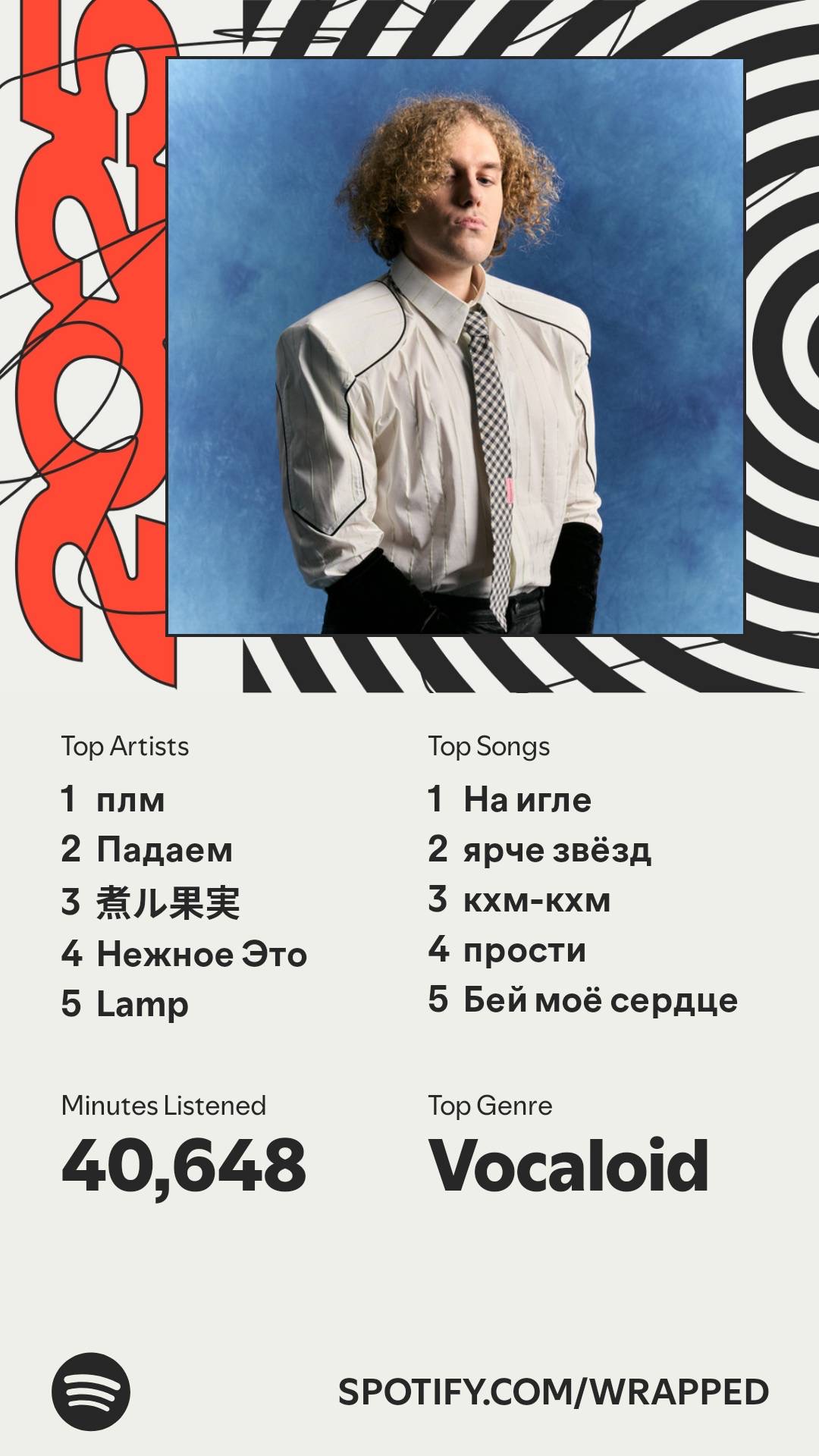 Poooowee man, mine is okay I guess. Geez, I mean I was like "either Polmarteri or Paedem is taking the top artist award this year", but it was kinda expected since I had been listening to them WAYYYY before Paedem came along to hypnotise me with 2 of his songs ("On the Needle" & "[someother song]") but 3/5 of my top songs are from Polmateri so yeah, I'm not really surprised about it. Also, I CAN'T BELIEVE IT! NILFRUITS IS ALWAYS 3RD UGHHHHH - okay, for refrence, in 2023, he was 3rd in my top artists (the "FRUITAGE" album was super good omg I'm getting my hands on it one day or another UGHHHH). Anyways, my top album of the year is NOMAN (by NILFRUITS) which... I think is incorrect because I only listen to NIL every like 4 months... or when he starts posting music- ohhhhh... I started listening to him again back in august/september because A. I really love his music and B. He released a song on my birthday again YAY!!!